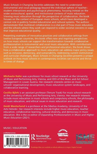 Michaela Hahn was a professor for music school research at the University of Music and Performing Arts, Vienna, and CEO of the Music and Art School Management in Lower Austria. Her research interests centre on music schools' organisational development, music education system landscapes, and collaborative learning. Cecilia Björk is an assistant professor (Tenure Track) for music school research at the University of Music and Performing Arts, Vienna. Her research interests include music education in music schools and compulsory schools, the philosophy of music education, and ethical issues in music education and research. Heidi Westerlund is a professor at the Sibelius Academy, University of the Arts Helsinki. Her research interests include higher music education, teacher education, collaborative learning, cultural diversity, and democracy in music education. She is the co-editor of Expanding Professionalism in Music and Higher Music Education (2021).