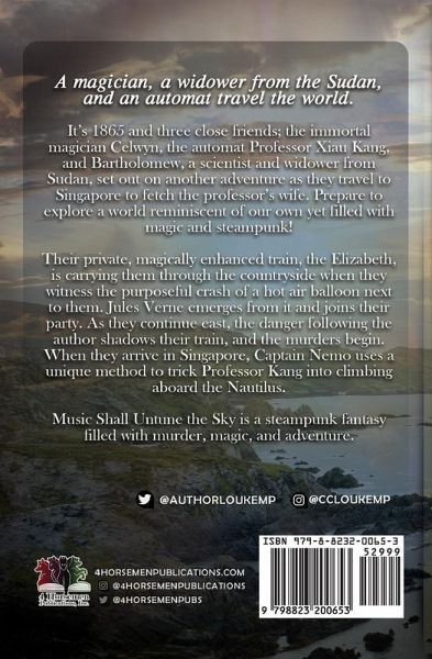 A magician, a widower from the Sudan, and an automat travel the world. It's 1865 and three close friends; the immortal magician Celwyn, the automat Professor Xiau Kang, and Bartholomew, a scientist and widower from Sudan, set out on another adventure as they travel to Singapore to fetch the professor's wife. Prepare to explore a world reminiscent of our own yet filled with magic and steampunk! Their private, magically enhanced train, the Elizabeth, is carrying them through the countryside when they witness the purposeful crash of a hot air balloon next to them. Jules Verne emerges from it and joins their party. As they continue east, the danger following the author shadows their train, and the murders begin. When they arrive in Singapore, Captain Nemo uses a unique method to trick Professor Kang into climbing aboard the Nautilus. Music Shall Untune the Sky is a steampunk fantasy filled with murder, magic, and adventure.