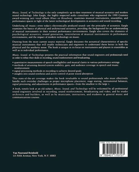 1 Fundamental Mathematical and Physical Concepts in Acoustics.- 1.1 The basic quantities: length, mass, and time.- 1.2 Velocity and acceleration.- 1.3 Vectors.- 1.4 Force, energy, and power.- 1.5 A simple oscillating system.- 1.6 Wave propagation.- 1.7 Sound fields.- 1.8 Power, sound pressure, and the decibel.- 1.9 Directional characteristics of sound radiators.- 1.10 Environmental acoustical effects.- 1.11 Interference effects.- References.- 2 Psychological Acoustics.- 2.1 Physiology of the ear.- 2.2 Loudness phenomena.- 2.3 Localization phenomena.- 2.4 Pitch perception.- 2.5 Critical bands; consonance and dissonance.- References.- Additional Resources.- 3 Scales, Temperament, and Tuning.- 3.1 Major and minor scales.- 3.2 The harmonic series.- 3.3 The Pythagorean scale.- 3.4 The just scale.- 3.5 Meantone temperament.- 3.6 Equal temperament.- 3.7 Equal temperament in musical practice.- 3.8 Other tunings in contemporary performance.- 3.9 Pitch standards.- 3.10 The pitch spiral; key chroma.- References.- Additional Resources.- 4 Musical Sound Generation and Radiation.- 4.1 Basic power relationships.- 4.2 The chordophones-strings and sounding boards.- 4.3 Aerophones I-a simple open air column.- 4.4 Aerophones II-reeds and resonators.- 4.5 Aerophones III-the lip reeds.- 4.6 Membranophones.- 4.7 Idiophones.- 4.8 Starting and stopping transients.- 4.9 The voice.- References.- 5 Acoustics of String Instruments.- 5.1 The violin.- 5.2 The string family.- 5.3 The guitar.- 5.4 The harp.- 5.5 Modern versions of the bass and the guitar.- 5.6 Acoustical characteristics of string instruments.- References.- Additional Resources.- 6 Acoustics of Woodwind Instruments.- 6.1 Classification of woodwind instruments.- 6.2 Transposing instruments.- 6.3 The flute.- 6.4 The oboe.- 6.5The clarinet.- 6.6 The bassoon.- 6.7 The saxophones.- 6.8 Acoustical characteristics of woodwind instruments.- References.- Additional Resources.- 7 Acoustics of Brass Instruments.- 7.1 Classification of brass instruments.- 7.2 Changing speaking length: crooks, valves, and slides.- 7.3 The horn.- 7.4 The trumpet.- 7.5 The trombone.- 7.6 The tuba.- 7.7 Acoustical characteristics of brass instruments.- References.- Additional Resources.- 8 Acoustics of Percussion Instruments.- 8.1 Classification of percussion instruments.- 8.2 Membranophones: the drum family.- 8.3 Metallophones.- 8.4 Xylophones.- 8.5 Ranges of the pitched metallophones and xylophones.- 8.6 Special effects.- 8.7 The drum set.- 8.8 Acoustical characteristics of percussion instruments.- References.- Additional Resources.- 9 Acoustics of Keyboard Instruments.- 9.1 Historical instruments.- 9.2 The piano.- 9.3 The celesta.- 9.4 The pipe organ.- 9.5 Electronic keyboard instruments.- 9.6 Acoustical characteristics of keyboard instruments.- References.- Additional Resources.- 10 Musical Ensembles.- 10.1 Evolution of chamber ensembles.- 10.2 Evolution of the orchestra.- 10.3 Acoustical power output of the orchestra.- 10.4 The vocal chorus with orchestra.- 10.5 Ensembles in the opera house.- 10.6 Ensembles in popular music.- 10.7 The musical theater.- 10.8 The symphonic band.- 10.9 Requirements for good ensemble and intonation.- 10.10 Sound pressure levels within ensembles.- 10.11 Spectra of ensembles.- References.- 11 Music and Speech in Performance Environments.- 11.1 Acoustics of enclosed spaces.- 11.2 Requirements for music performance spaces.- 11.3 Electronic concert halls.- 11.4 Halls for speech.- 11.5 Small halls for music performance.- 11.6 Acoustics of rehearsal spaces.- 11.7 Worship spaces.- 11.8 Acoustical isolation and noise control.- References.- Additional Resources.- 12 Principles of Speech and Music Reinforcement.- 12.1 Basic approaches.- 12.2 System stability and gain calculations.- 12.3 Intelligibility calculations.- 12.4 Systems for houses of worship.- 12.5 Systems for auditoriums.- 12.6 Systems for high-level music reinforcement.- 12.7 Systems for motion picture theaters.- References.- 13 Principles of Sound Recording.- 13.1 Basic system concepts.- 13.2 Microphones.- 13.3 Basic stereo pickup techniques.- 13.4 Magnetic recording.- 13.5 Signal processing.- 13.6 Recording system architecture.- References.- 14 High Fidelity Sound in the Home.- 14.1 Basic components of a high fidelity system.- 14.2 AM radio transmission and reception.- 14.3 FM radio transmission and reception.- 14.4 The long-playing (LP) record.- 14.5 The cassette.- 14.6 The compact disc (CD).- 14.7 Signal control.- 14.8 Amplifiers.- 14.9 Loudspeakers.- 14.10 Listening room considerations.- References.- 15 Overview of Music Synthesis.- 15.1 Anatomy of a musical sound.- 15.2 Attack: the initial transient.- 15.3 Steady-state conditions.- 15.4 Decay of tones.- 15.5 Ensemble considerations.- 15.6 Representation of steady-state waveforms in time and frequency domains.- 15.7 The performer's interface.- References.- 16 Active Noise Control.- 16.1 Principle of active sound cancellation.- 16.2 Sound pressure reduction.- 16.3 Sound power absorption at room boundaries.- 16.4 Recent developments.- 16.5 Conclusions.- References.- Additional Resource.