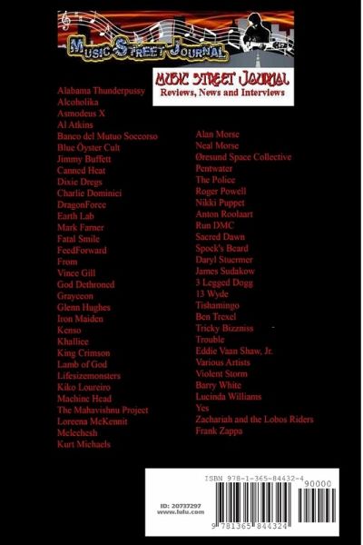 This is the book version of the April 2007 (#63) issue of Music Street Journal. It includes coverage of the following artists and more: Alabama Thunderpussy Asmodeus X Al Atkins Blue Öyster Cult Jimmy Buffett Canned Heat Dixie Dregs Charlie Dominici DragonForce Mark Farner Vince Gill God Dethroned Glenn Hughes Iron Maiden King Crimson Lamb of God Machine Head The Mahavishnu Project Loreena McKennit Melechesh Kurt Michaels Alan Morse Neal Morse Øresund Space Collective Pentwater The Police Roger Powell Run DMC Sacred Dawn Spock's Beard Daryl Stuermer James Sudakow Tishamingo Trouble Eddie Vaan Shaw, Jr. Violent Storm Barry White Lucinda Williams Yes Frank Zappa While Gary Hill compiled the book and did many of the articles, Michael Bader, Rick Damigella, Tim Jones, Lorraine Kay, Julie Knispel, Vivian Lee, Mike Korn, Greg Olma, Lisa Palmeno and Josh Turner all contributed articles and Brandi Carlton provided concert photos.