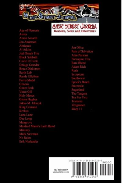 This is the book version of Music Street Journal's February 2007 (Issue 62) Issue. It includes coverage of the following artists: Age of Nemesis Aisles Amon Amarth Jon Anderson Antiquus Al Atkins Jodi Beach Trio Black Sabbath Circle II Circle Deluge Grander Bruce Dickinson Earth Lab Randy Ellefson Ferris Mudd Genesis Genre Peak Vince Gill Holy Moses Glenn Hughes Jakko M. Jakszyk King Crimson Krokus Lana Lane Dee Long Mangrove Manfred Mann's Earth Band Ministry Mark Newman No Rules Erik Norlander Jon Oliva Pain of Salvation Alan Parsons Porcupine Tree Rare Blend Adam Rich Rush Scorpions Southview Spock's Beard Starcastle Sugarland The Tangent Tea For Two Tristania Vengeance Warp 11 While Gary Hill compiled the book and did many of the articles, Steve Alspach, Rick Damigella, Julie Knispel, Mike Korn, Greg Olma and Lisa Palmeno all contributed articles.