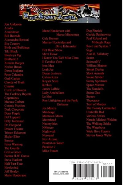 This is the book version of the December 2013 (103) issue of Music Street Journal. It includes coverage of the following artists and more: Jon Anderson Aradia Annihilator Bill Berends Alessandro Bertoni Big Country Birds and Buildings Tiki Black Blodwyn Pig Copernicus Deep Purple Def Leppard Dream Theater Europe Fates Warning CeeLo Green Pontus H.W. Gunve Steve Hackett Half Past Four Hawkwind Jeff Healey Steve Howe Krokus James LaBrie Lady Antebellum Le Mur Joe Matera Motörhead Neomythics Nightwish Nosound Nox Arcana Paradise 9 Mike Pinder Dug Pinnick Paul Roland Saga Saxon ScienceNV William Shatner Simak Dialog Space Mirrors The Standells Status Quo Narada Michael Walden The Waterboys Steven James Wylie While Gary Hill compiled the book and wrote many of the articles, Jason Hillenburg, Mike Korn, Greg Olma and Scott Prinzing all contributed articles and Greg Olma provided concert photos.