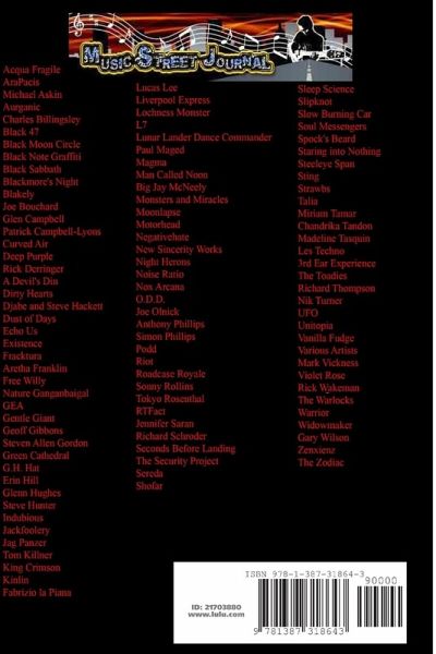 This is the book version of the December 2017 (127) issue of Music Street Journal. It includes coverage of the following artists and more: Acqua Fragile Black 47 Black Sabbath Blackmore's Night Joe Bouchard Glen Campbell Curved Air Deep Purple Rick Derringer Djabe and Steve Hackett Echo Us Aretha Franklin Nature Ganganbaigal Gentle Giant Glenn Hughes Steve Hunter Jag Panzer King Crimson L7 Magma Motorhead Nox Arcana Anthony Phillips Simon Phillips Riot Roadcase Royale Tokyo Rosenthal The Security Project Slipknot Spock's Beard Steeleye Span Sting Strawbs 3rd Ear Experience The Toadies Richard Thompson Nik Turner UFO Unitopia Vanilla Fudge Rick Wakeman Warrior Widowmaker Gary Wilson The Zodiac While Gary Hill compiled the book and wrote many of the articles, Rick Damigella, Mark Johnson, Mike Korn, Greg Olma and Larry Toering all contributed articles and Larry Toering supplied concert photos.