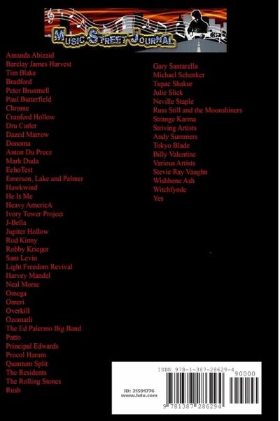 This is the book version of the June 2017 (124) issue of Music Street Journal. It includes coverage of the following artists and more: Amanda Abizaid Barclay James Harvest Tim Blake Bradford Peter Bruntnell Paul Butterfield Chrome Cranford Hollow Dru Cutler Dazed Marrow Mark Duda EchoTest Emerson, Lake and Palmer Hawkwind He Is Me Heavy AmericA Ivory Tower Project J-Bella Jupiter Hollow Rod Kinny Robby Krieger Light Freedom Revival Harvey Mandel Neal Morse Omega Overkill Ozomatli The Ed Palermo Big Band Patto Principal Edwards Procol Harum The Residents The Rolling Stones Rush Gary Santarella Michael Schenker Tupac Shakur Julie Slick Neville Staple Russ Still and the Moonshiners Strange Karma Andy Summers Tokyo Blade Billy Valentine Stevie Ray Vaughn Wishbone Ash Witchfynde Yes While Gary Hill compiled the book and wrote many of the articles, Mike Korn and Greg Olma contributed articles.