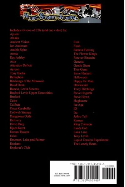 All the progressive rock CD and video reviews published at Music Street Journal from February 1998 through December 2000 of artists with names starting with A-F. Artists include: Ajalon Alaska Ancient Vision Jon Anderson Anubis Spire Arena Ray Ashley Asia Attention Deficit Ayreon Tony Banks Bellaphon Birdsongs of the Mesozoic Boud Deun Bozzio, Levin Stevens Bruford Levin Upper Extremities Bruford Cairo Caliban Oscar Caraballo Cobweb Strange Dangerous Odds Delivery Dixie Dreg Djam Karet Dream Theater Eclat Emerson, Lake and Palmer Enchant Explorer's Club Fish Flash Pamela Fleming The Flower Kings Forever Einstein Genesis Gentle Giant Trey Gunn Steve Hackett Although Gary Hill compiled this and did the bulk of the reviews, the book includes reviews from Steve Alspach, Sean Faust and Vivian Lee.