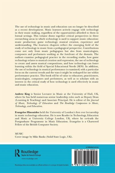 The use of technology in music and education can no longer be described as a recent development. Music learners actively engage with technology in their music making, regardless of the opportunities afforded to them in formal settings. This volume draws together critical perspectives in three overarching areas in which technology is used to support music education: music production; game technology; musical creation, experience and understanding. The fourteen chapters reflect the emerging field of the study of technology in music from a pedagogical perspective. Contributions come not only from music pedagogues but also from musicologists, composers and performers working at the forefront of the domain. The authors examine pedagogical practice in the recording studio, how game technology relates to musical creation and expression, the use of technology to create and assess musical compositions, and how technology can foster learning within the field of Special Educational Needs (SEN). In addition, the use of technology in musical performance is examined, with a particular focus on the current trends and the ways it might be reshaped for use within performance practice. This book will be of value to educators, practitioners, musicologists, composers and performers, as well as to scholars with an interest in the critical study of how technology is used effectively in music and music education.