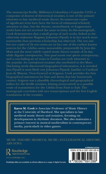 The manuscript Seville, Biblioteca Colombina y Capitular 5-2-25, a composite of dozens of theoretical treatises, is one of the primary witnesses to late medieval music theory. Its numerous copies of significant texts have been the focus of substantial scholarly attention to date, but the shorter, unattributed, or fragmentary works have not yet received the same scrutiny. In this monograph, Cook demonstrates that a small group of such works, linked to the otherwise unknown Magister Johannes Pipudi, is in fact much more noteworthy than previous scholarship has observed. The not one but two copies of De arte cantus are in fact one of the earliest known sources for the Libellus cantus mensurabilis, purportedly by Jean des Murs and the most widely copied music theory treatise of its day, while Regulae contrapunctus, Nota quod novem sunt species contrapunctus, and a concluding set of notes in Catalan are early witnesses to the popular Ars contrapuncti treatises also attributed to des Murs. Disclosing newly discovered biographical information, it is revealed that Pipudi is most likely one Johannes Pipardi, familiar to Cardinal Jean de Blauzac, Vicar-General of Avignon. Cook provides the first biographical assessment for him and shows that late fourteenth-century Avignon was a plausible chronological and geographical milieu for the Seville treatises, hinting provocatively at a possible route of transmission for the Libellus from Paris to Italy. The monograph concludes with new transcriptions and the first English translations of the treatises.