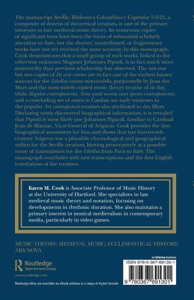 The manuscript Seville, Biblioteca Colombina y Capitular 5-2-25, a composite of dozens of theoretical treatises, is one of the primary witnesses to late medieval music theory. Its numerous copies of significant texts have been the focus of substantial scholarly attention to date, but the shorter, unattributed, or fragmentary works have not yet received the same scrutiny. In this monograph, Cook demonstrates that a small group of such works, linked to the otherwise unknown Magister Johannes Pipudi, is in fact much more noteworthy than previous scholarship has observed. The not one but two copies of De arte cantus are in fact one of the earliest known sources for the Libellus cantus mensurabilis, purportedly by Jean des Murs and the most widely copied music theory treatise of its day, while Regulae contrapunctus, Nota quod novem sunt species contrapunctus, and a concluding set of notes in Catalan are early witnesses to the popular Ars contrapuncti treatises also attributed to des Murs. Disclosing newly discovered biographical information, it is revealed that Pipudi is most likely one Johannes Pipardi, familiar to Cardinal Jean de Blauzac, Vicar-General of Avignon. Cook provides the first biographical assessment for him and shows that late fourteenth-century Avignon was a plausible chronological and geographical milieu for the Seville treatises, hinting provocatively at a possible route of transmission for the Libellus from Paris to Italy. The monograph concludes with new transcriptions and the first English translations of the treatises.