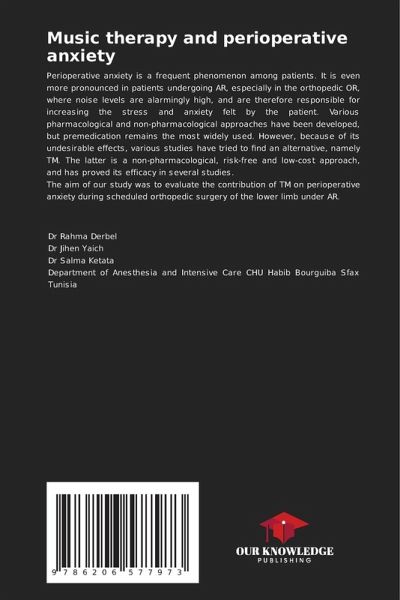 Perioperative anxiety is a frequent phenomenon among patients. It is even more pronounced in patients undergoing AR, especially in the orthopedic OR, where noise levels are alarmingly high, and are therefore responsible for increasing the stress and anxiety felt by the patient. Various pharmacological and non-pharmacological approaches have been developed, but premedication remains the most widely used. However, because of its undesirable effects, various studies have tried to find an alternative, namely TM. The latter is a non-pharmacological, risk-free and low-cost approach, and has proved its efficacy in several studies.The aim of our study was to evaluate the contribution of TM on perioperative anxiety during scheduled orthopedic surgery of the lower limb under AR.
