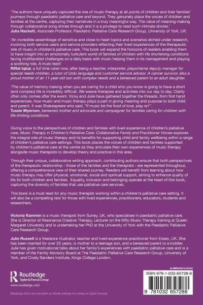 Victoria Kammin is a music therapist from Surrey, UK, who specialises in paediatric palliative care. She is Director of Resonance Creative Therapy, Lecturer on the MSc Music Therapy training at Queen Margaret University and undertaking her PhD at the University of York with the Paediatric Palliative Care Research Group. Julie Russell is a freelance illustrator, teacher and lived-experience practitioner from Essex, UK. She has been married for over 25 years, is mother to a teenage son, and a bereaved parent to a toddler. Julie has given motivational talks about her family's experiences with paediatric palliative care and is a member of the Family Advisory Board at The Paediatric Palliative Care Research Group, University of York, and Cicely Sanders Institute, Kings College London.