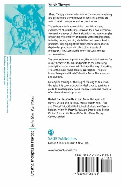 `Rachel Darnley-Smith and Helen M Patey have managed so well to tell their story of music therapy offering the framework of theory, training and professional practice, and the complimentary value of Analytical Music Therapy and Creative Music Therapy within improvization. The authors devote a whole chapter to promoting a wider understanding of improvisation, describing its value as a form of play, free association, with more or less structure depending on the form of intervention and the client's needs. There is really a valuable resource of meaningful and relevant examples from their own clinical work. These examples clearly validate and illustrate the seminal theoretical concept of the first great pioneer of music therapy in the United Kingdom, Juliette Alvin, who taught us that music is a creation of people, and therefore we can see people in their music' - Professor Tony Wigram