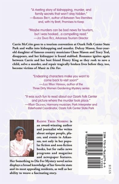 Carrie McCrite and several friends have planned a weekend vacation at the Ozark Folk Center State Park in remote Stone County, Arkansas, where they're signed up for craft classes. Crafts take a back seat to a kidnapping, arson, and murder after Dulcey Mason, four-year-old daughter of famous country musicians Chase Mason and Tracy Teal, disappears, and her abductor is found stabbed, his house burned. Romance ignites again between Carrie and her best friend Henry King as they rush to save a child, solve a murder, and repair tragically broken lives before they, too, become victims of Music to Die For.