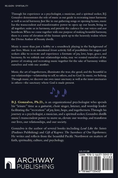 Through his experience as a psychologist, a musician, and a spiritual seeker, B.J. Gonzalvo demonstrates the role of music as our guide in recreating inner harmony as well as social harmony. Just like in our gathering songs or opening hymns, music has the transcendent and transformative power to open up our hearts, bring us all together, unite us in harmony, and provide the cadence for our voices and our heartbeats. When we come together with one purpose of making beautiful harmony, there is a sense of elevation of the human spirit up to the heavenly realms where the Divine Author of beauty dwells. Music is more than just a hobby or a soundtrack playing in the background of our lives. Music is an intentional leisure activity full of possibilities for singers and seekers alike to recreate and experience a foretaste of joy, love, hope, grace, and harmony. As we rethink our relationships today, may we remind ourselves of the power of creating and recreating music together for the sake of harmony within ourselves and with one another. Music, the art of togetherness, illuminates the true, the good, and the beautiful in our relationships-relationship to self, to others, and to God. In music, we belong. Through music, we discover our own inner sanctuary as well as the inner sanctuaries in others-the sanctuary where God is made present.