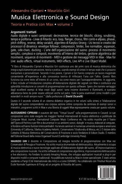 Il secondo volume di un'opera fondamentale dedicata alla sintesi e alla elaborazione del suono con Max e MSP. Il presente volume è composto da più di 650 pagine su sintesi, elaborazione del suono e programmazione Max, esempi sonori e interattivi, centinaia di patch, supporti online, test, attività di reverse engineering, ecc. Include inoltre un esteso capitolo su Max for Live, un'applicazione con cui è possibile creare plug-in per il software Ableton Live. È un sistema didattico organico in tre volumi e una parte online che sviluppa una concezione aperta e interattiva dell'insegnamento e dell'apprendimento della musica elettronica e del sound design.