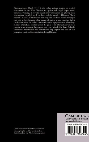 Musica getutscht (Basel, 1511) is the earliest printed treatise on musical instruments in the West. Written by a priest and chapel singer named Sebastian Virdung, it provided rudimentary instruction on playing three instruments: the clavichord, the lute, and the recorder. This early 'do-it-yourself' manual of instruction not only tells us about music-making in that era, it also illumines other aspects of society in the years just before the Reformation. Its author communicates in a popular style, choosing a mixture of media: a written text in the guise of an informal conversation, coupled with woodcut illustrations and visual aids. Enthusiasts of early music and its performance as well as historians of art, society, and the German language will welcome Beth Bullard's substantial introduction and annotations, which help explain the text of this important work and its place in intellectual history.