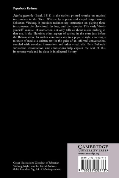 Musica getutscht (Basel, 1511) is the earliest printed treatise on musical instruments in the West. Written by a priest and chapel singer named Sebastian Virdung, it provided rudimentary instruction on playing three instruments: the clavichord, the lute and the recorder. This early 'do-it-yourself' manual of instruction not only tells us about music-making in that era, it also illumines other aspects of society in the years just before the Reformation. Its author communicates in a popular style, choosing a mixture of media: a written text in the guise of an informal conversation, coupled with woodcut illustrations and visual aids. Enthusiasts of early music and its performance as well as historians of art, society and the German language will welcome Beth Bullard's substantial introduction and annotations, which help explain the text of this important work and its place in intellectual history.