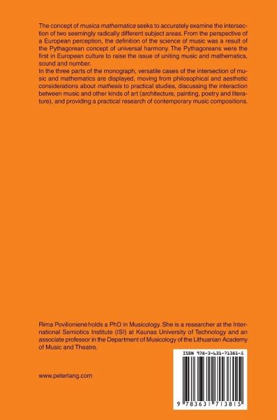 In the three parts of the monograph, versatile cases of the intersection of music and mathematics are displayed, moving from philosophical and aesthetic considerations about mathesis to practical studies, discussing the interaction between music and other kinds of art (architecture, painting, poetry and literature), and providing a practical research of contemporary music compositions.