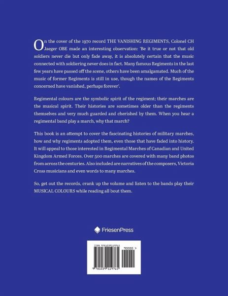 On the cover of the 1970 record THE VANISHING REGIMENTS, Colonel CH Jaeger OBE made an interesting observation: 'Be it true or not that old soldiers never die but only fade away, it is absolutely certain that the music connected with soldiering never does in fact. Many famous Regiments in the last few years have passed off the scene, others have been amalgamated. Much of the music of former Regiments is still in use, though the names of the Regiments concerned have vanished, perhaps forever'. Regimental colours are the symbolic spirit of the regiment; their marches are the musical spirit. Their histories are sometimes older than the regiments themselves and very much guarded and cherished by them. When you hear a regimental band play a march, why that march? This book is an attempt to cover the fascinating histories of military marches, how and why regiments adopted them, even those that have faded into history. It will appeal to those interested in Regimental Marches of Canadian and United Kingdom Armed Forces. Over 500 marches are covered with many band photos from across the centuries. Also included are narratives of the composers, Victoria Cross musicians and even words to many marches. So, get out the records, crank up the volume and listen to the bands play their MUSICAL COLOURS while reading all bout them.