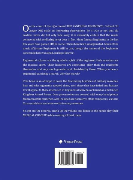 On the cover of the 1970 record THE VANISHING REGIMENTS, Colonel CH Jaeger OBE made an interesting observation: 'Be it true or not that old soldiers never die but only fade away, it is absolutely certain that the music connected with soldiering never does in fact. Many famous Regiments in the last few years have passed off the scene, others have been amalgamated. Much of the music of former Regiments is still in use, though the names of the Regiments concerned have vanished, perhaps forever'. Regimental colours are the symbolic spirit of the regiment; their marches are the musical spirit. Their histories are sometimes older than the regiments themselves and very much guarded and cherished by them. When you hear a regimental band play a march, why that march? This book is an attempt to cover the fascinating histories of military marches, how and why regiments adopted them, even those that have faded into history. It will appeal to those interested in Regimental Marches of Canadian and United Kingdom Armed Forces. Over 500 marches are covered with many band photos from across the centuries. Also included are narratives of the composers, Victoria Cross musicians and even words to many marches. So, get out the records, crank up the volume and listen to the bands play their MUSICAL COLOURS while reading all bout them.