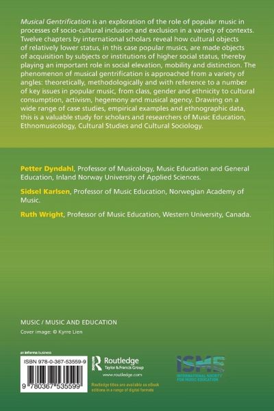 Musical Gentrification is an exploration of the role of popular music in processes of socio-cultural inclusion and exclusion in a variety of contexts. Twelve chapters by international scholars reveal how cultural objects of relatively lower status, in this case popular musics, are made objects of acquisition by subjects or institutions of higher social status, thereby playing an important role in social elevation, mobility and distinction. The phenomenon of musical gentrification is approached from a variety of angles: theoretically, methodologically and with reference to a number of key issues in popular music, from class, gender and ethnicity to cultural consumption, activism, hegemony and musical agency. Drawing on a wide range of case studies, empirical examples and ethnographic data, this is a valuable study for scholars and researchers of Music Education, Ethnomusicology, Cultural Studies and Cultural Sociology.