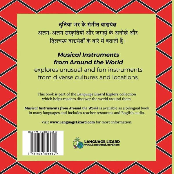 What instrument can be made from animal bone? Do you know there's an instrument shaped like a musical note? What instrument was created by African slaves to express themselves? Explore the answers to these questions and more with Musical Instruments from Around the World. Filled with bright illustrations and interesting facts, this book will entertain and educate readers of all ages. Musical Instruments from Around the World explores unusual and fun instruments from diverse cultures and locations. Part of the Language Lizard Explore collection, this book helps readers discover the world around them. Musical Instruments from Around the World is available as a bilingual book in many languages and includes access to FREE LESSON PLANS, English audio, and fun activities to support multicultural education. THIS TITLE IS AVAILABLE IN MANY BILINGUAL EDITIONS.