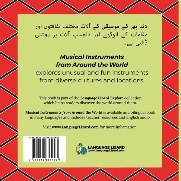 What instrument can be made from animal bone? Do you know there's an instrument shaped like a musical note? What instrument was created by African slaves to express themselves? Explore the answers to these questions and more with Musical Instruments from Around the World. Filled with bright illustrations and interesting facts, this book will entertain and educate readers of all ages. Musical Instruments from Around the World explores unusual and fun instruments from diverse cultures and locations. Part of the Language Lizard Explore collection, this book helps readers discover the world around them. Musical Instruments from Around the World is available as a bilingual book in many languages and includes access to FREE LESSON PLANS, English audio, and fun activities to support multicultural education. THIS TITLE IS AVAILABLE IN MANY BILINGUAL EDITIONS.