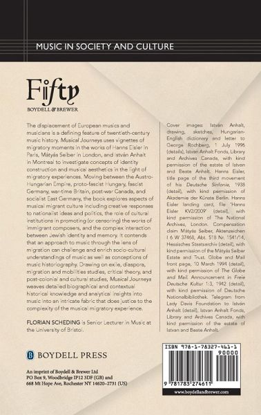 The displacement of European musics and musicians is a defining feature of twentieth-century music history. Musical Journeys uses vignettes of migratory moments in the works of Hanns Eisler in Paris, Mtys Seiber in London, and Istvn Anhalt in Montreal to investigate concepts of identity construction and musical aesthetics in the light of migratory experiences. Moving between the Austro-Hungarian Empire, proto-fascist Hungary, fascist Germany, war-time Britain, post-war Canada, and socialist East Germany, the book explores aspects of musical migrant culture including creative responses to nationalist ideas and politics, the role of cultural institutions in promoting (or censoring) the works of immigrant composers, and the complex interaction between Jewish identity and memory. It contends that an approach to music through the lens of migration can challenge and enrich socio-cultural understandings of music as well as conceptions of music historiography. Drawing on exile, diaspora, migration and mobilities studies, critical theory, and post-colonial and cultural studies, Musical Journeys weaves detailed biographical and contextual historical knowledge and analytical insights into music into a complex fabric that does justice to the complexity of the musical migratory experience. FLORIAN SCHEDING is Lecturer in Music at the University of Bristol.