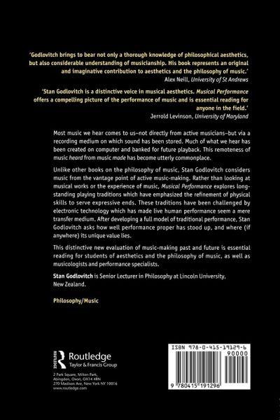 Most music we hear comes to us via a recording medium on which sound has been stored. Such remoteness of music heard from music made has become so commonplace it is rarely considered. Musical Performance: A Philosophical Study considers the implications of this separation for live musical performance and music-making. Rather than examining the composition or perception of music as most philosophical accounts of music do, Stan Godlovitch takes up the problem of how the tradition of active music playing and performing has been challenged by technology and what problems this poses for philosophical aesthetics. Where does does the value of musical performance lie? Is human performance of music a mere transfer medium? Is the performance of music more expressive than recorded music? Musical Performance poses questions such as these to develop a fascinating account of music today. musicians - but via some recording medium on which sound has been stored.