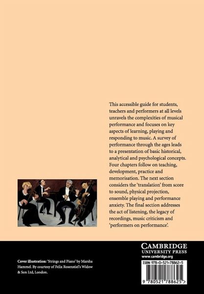 This accessible guide for students, teachers and performers at all levels unravels the complexities of musical performance and focuses on key aspects of learning, playing and responding to music. A survey of performance through the ages leads to a presentation of basic historical, analytical and psychological concepts. Four chapters follow on teaching, development, practice and memorisation. The next section considers the 'translation' from score to sound, physical projection, ensemble playing and performance anxiety. The final section addresses the act of listening, the legacy of recordings, music criticism and 'performers on performance'.