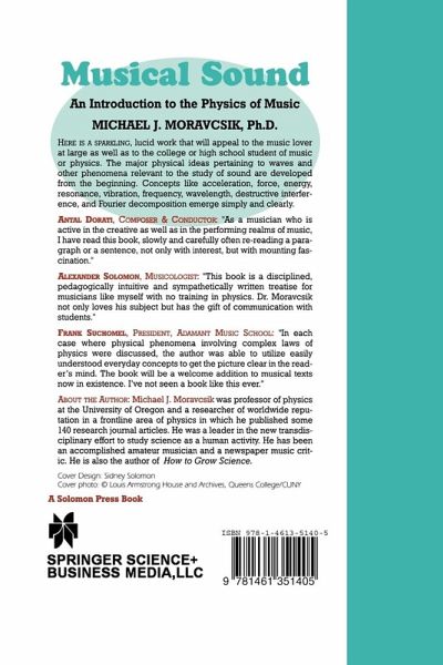Why and How-An Explanation for the Reader.- I The Concepts of Motion, Vibration and Waves.- Prologue.- 1 About Motion.- 2 Periodic Motion: Vibration and Oscillation.- 3 Waves.- II The Sound Getting to you.- 4 Propagation of Sound Waves.- 5 Perception of Sound.- III Specifics of Musical Sound.- 6 Musical Sound.- 7 Pitch and Musical Scales.- IV Making Music.- 8 Musical Instruments.- 9 Wind Instruments.- 10 String Instruments.- 11 Percussion Instruments.- 12 The Human Voice.- V Consuming Music.- 13 The Environment for Listening.- 14 The Transmission and Storage of Sound.- Epilogue.- Appendix a Mathematics.- Arithmetic with Integers.- Arithmetic with Fractions.- Proportional and Inversely Proportional.- Powers.- Appendix B Formulas.- Symbols Used.- 1.- 2.- 3.- 4.- 5.- 9.- 10.- 13.- Appendix C Annotated Bibliography.- Exercise problems.- 1.- 2.- 3.- 4.- 5.- 6.- 7.- 9.- 10.- 11.- 12.- 13.- 14.- Solutions to Exercise Problems.- 1.- 2.- 3.- 4.- 5.- 6.- 7.- 9.- 10.- 11.- 12.- 13.- 14.