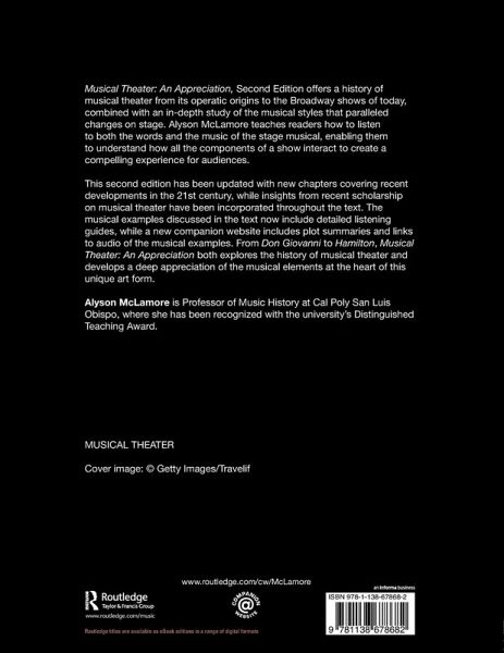Musical Theater: An Appreciation, Second Edition offers a history of musical theater from its operating origins to the Broadway shows of today, combined with an in-depth study of the musical styles that paralleled changes on stage. Alyson McLamore teaches readers how to listen to both the words and the music of the stage musical, enabling them to understand how all the components of a show interact to create a compelling experience for audiences. This second edition has been updated with new chapters covering recent developments in the twenty-first century, while insights from recent scholarship on musical theater have been incorporated throughout the text. The musical examples discussed in the text now include detailed listening guides, while a new companion website includes plot summaries and links to audio of the musical examples. From Don Giovanni to Hamilton, Musical Theater: An Appreciation both explores the history of musical theater and develops a deep appreciation of the musical elements at the heart of this unique art form.