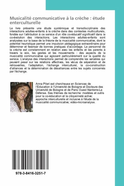 Le livre présente une étude systémique et transdisciplinaire des interactions adultes-enfants à la crèche dans des contextes multiculturels, fondée sur l'attribution à ce service d'un rôle co-éducatif significatif dans la co-évolution des interactions. Les interactions adultes-enfants sont analysées sur la base de la théorie de la musicalité communicative, dont le potentiel heuristique permet une impulsion pédagogique extraordinaire pour déterminer et favoriser de bonnes pratiques d'accordage. Le personnel de la crèche est constamment en relation avec les enfants et les parents à travers la voix, les gestes et les mouvements : des aspects de la musicalité communicative qui agissent particulièrement sur la qualité du service. L'analyse des interactions permet de comprendre les variables qui peuvent peser sur les relations affectives, les vécus de séparation et de retrouvailles, l'adaptation, l'échange interculturel, la co-construction d'alliances et la détermination de désalliances entre les sujets concernés par l'échange.
