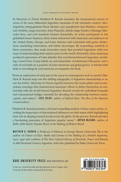 In Musicians in Transit Matthew B. Karush examines the transnational careers of seven of the most influential Argentine musicians of the twentieth century: Afro-Argentine swing guitarist Oscar Alemán, jazz saxophonist Gato Barbieri, composer Lalo Schifrin, tango innovator Astor Piazzolla, balada singer Sandro, folksinger Mercedes Sosa, and rock musician Gustavo Santaolalla. As active participants in the globalized music business, these artists interacted with musicians and audiences in the United States, Europe, and Latin America and contended with genre distinctions, marketing conventions, and ethnic stereotypes. By responding creatively to these constraints, they made innovative music that provided Argentines with new ways of understanding their nation's place in the world. Eventually, these musicians produced expressions of Latin identity that reverberated beyond Argentina, including a novel form of pop ballad; an anti-imperialist, revolutionary folk genre; and a style of rock built on a pastiche of Latin American and global genres. A website with links to recordings by each musician accompanies the book.