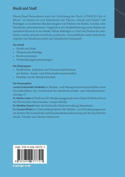 Dieser Band thematisiert nach der Verleihung des Titels "UNESCO City of Music" an Hannover und Mannheim das Thema "Musik und Städte" mit Beiträgen zu konkreten Musikstrategien von Städten wie Berlin, London oder Stockholm, internationalen Vergleichen der Musikförderung sowie Städten als narratives Element in der Musik. Neben Beiträgen zu Titel und Thema des Jahrbuchs werden aktuelle rechtliche, politische, wirtschaftliche sowie ästhetische Aspekte von Musikwirtschaft und Musikkultur behandelt.