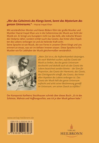 "Wer das Geheimnis des Klangs kennt, kennt das Mysterium des ganzen Universums." - Hazrat Inayat KhanMit verständlichen Worten und klaren Bildern führt der große Musiker und Mystiker Hazrat Inayat Khan uns in die Geheimnisse der Musik aus Sicht der Mystik ein. Er bringt uns Europäern nicht nur das tiefe, alte indische Wissen des Vedanta näher, sondern erklärt auch das Gesetz, das hinter allen Aspekten des Lebens verborgen ist und als heilende Kraft wirkt. Seine Sprache ist wie Musik, die von Ferne in unseren Ohren klingt und uns erinnert an etwas, was wir im tiefsten Inneren wissen. Diese Sprache ist für Musiker wie für Liebhaber der Musik gleichermaßen verständlich."Mein Ziel ist es, die Aufmerksamkeit derjenigen, die nach Wahrheit suchen, auf das Gesetz der Musik zu lenken, das das ganze Universum durchwirkt und deshalb auch als das Gesetz des Lebens bezeichnet werden könnte - der Sinn für Proportion, das Gesetz der Harmonie, das Gesetz, das Gleichgewicht schafft, das Gesetz, das hinter allen Aspekten des Lebens verborgen ist. Das Gesetz der Musik hält das ganze Universum aufrecht und wirkt seiner Bestimmung gemäß im Universum, um seinen Zweck zu erfüllen."Der Komponist Karlheinz Stockhausen schrieb über dieses Buch: "Es ist das Schönste, Wahrste und Hoffnungsvollste, was ich je über Musik gelesen habe."