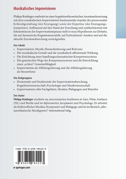 Philipp Roidinger erarbeitet in einer kognitionstheoretischen Auseinandersetzung mit dem musikalischen Improvisieren fundamentale Aspekte der prozessualen Echtzeitgestaltung (der Erzeugung) sowie der Expertise (der Erzeugungskompetenz). Aufbauend auf den Stand der Forschung und synthetisierend mit Erkenntnissen der Improvisationspraxis stellt er neue Hypothesen zur Debatte, die auf dynamische Kognitionsmodelle, auf Embodiment-Ansätze und auf die aktuelle Emotionsforschung zurückgreifen.