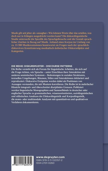 Das Buch widmet sich populären Musikdiskursen aus einer interdisziplinären diskurslinguistischen und korpuspragmatischen Perspektive. Es wird die Frage gestellt, wie Phänomene, die als schwer benennbar oder auch als unsagbar gelten, mit Worten beschrieben und bewertet werden: Musik und Klang nämlich, sowie ihr ästhetisches Erleben und ihre kulturelle Bedeutung. Ca. 13.500 Musikrezensionen unterschiedlicher Genres zwischen Pop und Klassik werden vor diesem Hintergrund untersucht. Zentrum des Interesses ist die Art und Weise der sprachlich-diskursiven Konstituierung musikalisch-ästhetischer Diskursobjekte und Kategorien im Verhältnis zum Metadiskurs der Unsagbarkeit von Musik. Das Augenmerk richtet sich dabei auf die Spezifik des diskursiven Sprach- und Zeichengebrauchs, vor allem in Kollokationen, nominalen Wortverbindungen und attributiven Clustern. Die Korpusanalysen zeigen erstmals empirisch, wie Musik im Diskurs mit sprachlichen Mustern, sprachlicher Kreativität und Dichte verwoben ist, wenn über musikalische Eigenschaften und klangliche Eigenheiten gesprochen bzw. geschrieben wird. Die Ergebnisse geben nicht zuletzt Aufschluss über das Verhältnis von Musterhaftigkeit und Diversität im Sprachgebrauch.