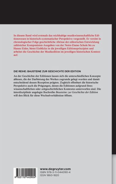 In diesem Band wird erstmals das reichhaltige musikwissenschaftliche Editionswesen in historisch-systematischer Perspektive vorgestellt, das in Deutschland vor allem von den renommierten Musiker-Gesamtausgaben geprägt wird. Der Band vereint in chronologischer Folge geschichtliche Abrisse der editorischen Entwicklung zahlreicher Komponisten-Ausgaben von Notre-Dame bis Hanns Eisler und bietet damit nicht nur Einblicke in die jeweiligen Editionsprinzipien, sondern arbeitet darüber hinaus auch allgemein die Geschichte der Musikedition im jeweiligen historischen Kontext auf. Damit erfüllt der Band ein vielfach beklagtes Desiderat sowohl in der musik-, als auch in der editionswissenschaftlichen Forschungslandschaft. Als Autoren konnten führende Persönlichkeiten aus den einschlägigen Editionsinstituten gewonnen werden.