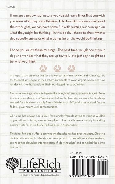 In the past, Christine has written a few entertainment reviews and humor stories for the local newspaper in the Eastern Panhandle of West Virginia, where she now resides with her husband and their four-legged fur baby, Winter. She attended high school in Hyattsville, Maryland, and graduated in 1968. From there, she enrolled in the Washington School for Secretaries, and after finishing, worked for a business supply firm in Washington, DC, and later worked for the federal government until her retirement. Christine has always had a love for animals, from donating to various wildlife organizations to taking needed supplies to her local humane society to mailing cooling vests for the military working dogs in Afghanistan. This is her first book. After observing the dogs she has had over the years, Christine decided she needed to take a humorous approach to their actions and mannerisms, so she jotted down her interpretation of "dog thoughts" and compiled them into this book.