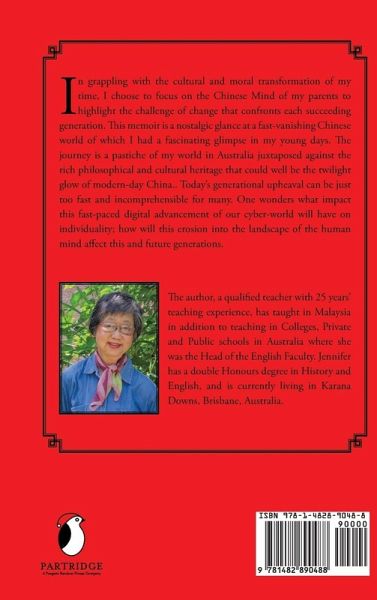 This book is a memoir of my traditional Chinese parents whose resilience and courage was representative of our pioneering forefathers. With their passing, I see the vanishing of the Old China which philosophical heritage, idealism and romance has shaped the Chinese mind for centuries. Our upbringing highlighted the importance of Respect and Responsibility within the context of a code of conduct. The book is a literary pastiche - a montage of my world in Australia juxtaposed against the exquisite brocade of the other world. Today's China is a vibrant part of our cyber-world, the impact of which could be encompassing on one's individuality. What kind of persons will our young generation and the future generations become.
