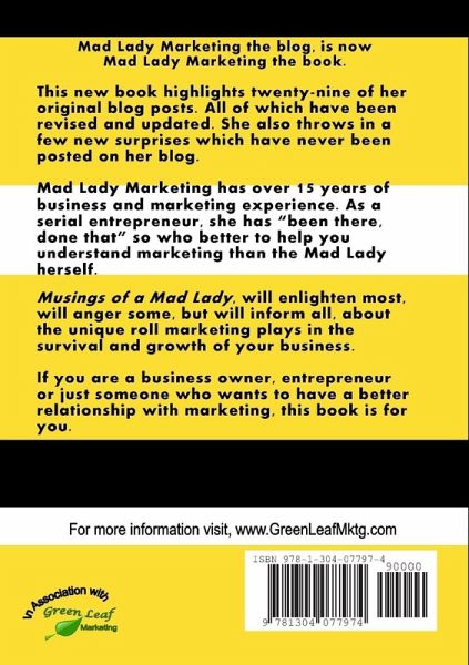 Mad Lady Marketing the blog, is now Mad Lady Marketing the book. This new book highlights twenty-nine of her original blog posts. All of which have been revised and updated. She also throws in a few new surprises which have never been posted on her blog. Mad Lady Marketing has over 15 years of business and marketing experience. As a serial entrepreneur, she has "been there, done that" so who better to help you understand marketing than the Mad Lady herself. Musings of a Mad Lady, will enlighten most, will anger some, but will inform all, about the unique roll marketing plays in the survival and growth of your business. If you are a small business owner, entrepreneur or just someone who wants to have a better relationship with marketing, this book is for you. Mad Lady Marketing gives it to you straight with no chaser. You will either love her or hate her but either way, you're guaranteed to learn something new about marketing.