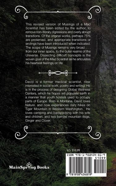 This revised version of Musings of a Mad Scientist has been edited by the author, to remove non-literary digressions and overly abrupt transitions. Of the original works, perhaps 75% are preserved, and appropriate transitions or endings have been introduced when indicated. The scope of Musings remains very broad... from our inner space, to the outer realms of the Universe. Dissecting difficult concepts is the woven goal of the Mad Scientist as he articulates his heartiest feelings on life.