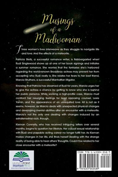 Three women's lives interweave as they struggle to navigate life and love. And the effects of a meteorite. Patricia Steitz, a successful romance writer, is flabbergasted when Rudi Singlewood shows up at one of her book signings and initiates a summer romance. She worries that the fantasies she's harbored regarding the world-renown Broadway actress may prevent her from accepting who Rudi really is. She relates her fears to her best friend, Marcia Struthers, a successful Manhattan litigator. Knowing that Patricia has dreamed of Rudi for years, Marcia urges her to give the actress a chance by getting to know who she is behind her public persona. While working a high-profile case, Marcia must confront her resurging feelings for lead opposing counsel, Lexie Yamin, and the appearance of an unrequited love. All is not as it seems, however, as Marcia deals with unexpected physical changes and developing mental abilities after an encounter with a meteorite. Marcia's not the only one dealing with changes induced by an extraterrestrial rock, though. Kiernan Connelly, who has received intriguing letters over several months, begins to question her lifestyle. Her casual sexual relationship with Rudi and passable acting career no longer fulfill her. As Kiernan makes changes in her life, she finds herself dealing with the strange reality of being able to hear others' thoughts. Could it be related to her close encounter with a meteorite?