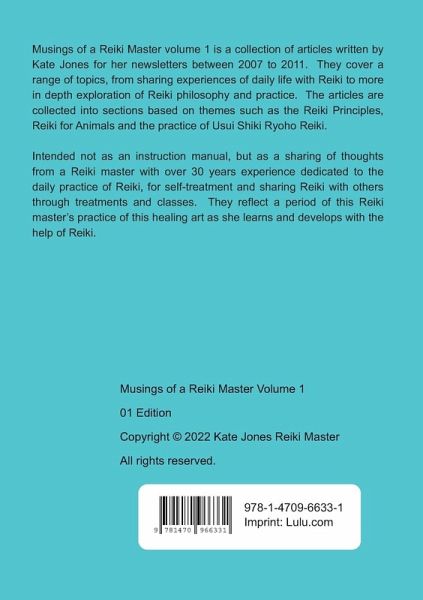 Musings of a Reiki Master volume 1 is a collection of articles written by Kate Jones for her newsletters between 2007 to 2011. They cover a range of topics, from sharing experiences of daily life with Reiki to more in depth exploration of Reiki philosophy and practice. The articles are collected into sections based on themes such as the Reiki Principles, Reiki for Animals and the practice of Usui Shiki Ryoho Reiki. Pre-dating her blog, they are only available in this published form. This print version includes photographic illustrations, most of which accompanied the original articles and most taken by the author. This book is not intended as an instruction manual, but as a sharing of thoughts from a Reiki master dedicated to the daily practice of Reiki, for self-treatment and sharing Reiki with others through treatments and classes. They reflect a period of this experienced Reiki master's practice of this healing art as she learns and develops with the help of Reiki.