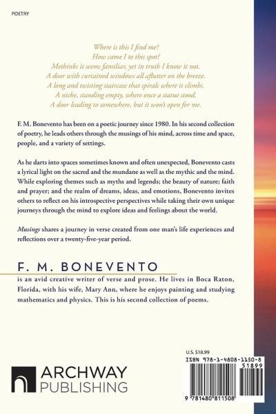 Where is this I find me? How came I to this spot? Methinks it seems familiar, yet in truth I know it not. A door with curtained windows all aflutter on the breeze. A long and twisting staircase that spirals where it climbs. A niche, standing empty, where once a statue stood. A door leading to somewhere, but it won’t open for me. F. M. Bonevento has been on a poetic journey since 1980. In his second collection of poetry, he leads others through the musings of his mind, across time and space, people, and a variety of settings. As he darts into spaces sometimes known and often unexpected, Bonevento casts a lyrical light on the sacred and the mundane as well as the mythic and the mind. While exploring themes such as myths and legends; the beauty of nature; faith and prayer; and the realm of dreams, ideas, and emotions, Bonevento invites others to reflect on his introspective perspectives while taking their own unique journeys through the mind to explore ideas and feelings about the world. Musings shares a journey in verse created from one man’s life experiences and reflections over a twenty-five-year period.