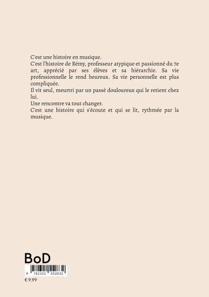 C'est une histoire en musique. C'est l'histoire de Rémy, professeur atypique et passionné du 7e art, apprécié par ses élèves et sa hiérarchie. Sa vie professionnelle le rend heureux. Sa vie personnelle est plus compliquée. Il vit seul, meurtri par un passé douloureux qui le retient chez lui. Une rencontre va tout changer. C'est une histoire qui s'écoute et qui se lit, rythmée par la musique.