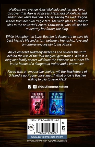 The begrudging Giusi Malvado and his spy, the abject Nino, discover that Alex is none other than Princess Alexandra of Kieland. Set on revenge against the Musketeers of Orleandia, the evil pair abduct her under the very noses of Bastien and his Musketeers, who are too busy to save the Tsar of Kasak and his daughter from a disastrous battle to notice the plot against one of their own. Bastien soon realises that Malvado's evil plan is to ransom Alex to the powerful Crowsnest who will surely use her to get King Charles II to abdicate and surrender Kieland to the Republican army once and for all. Torn between, friendship, love and loyalty to his King, Bastien is desperate to get to Kieland to save his best friend. But how much are the Musketeers willing to sacrifice to rescue one of their own?