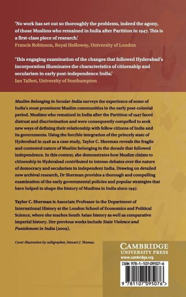 Muslim Belonging in Secular India surveys the experience of some of India's most prominent Muslim communities in the early postcolonial period. Muslims who remained in India after the Partition of 1947 faced distrust and discrimination, and were consequently compelled to seek new ways of defining their relationship with fellow citizens of India and its governments. Using the forcible integration of the princely state of Hyderabad in 1948 as a case study, Taylor C. Sherman reveals the fragile and contested nature of Muslim belonging in the decade that followed independence. In this context, she demonstrates how Muslim claims to citizenship in Hyderabad contributed to intense debates over the nature of democracy and secularism in independent India. Drawing on detailed new archival research, Dr Sherman provides a thorough and compelling examination of the early governmental policies and popular strategies that have helped to shape the history of Muslims in India since 1947.