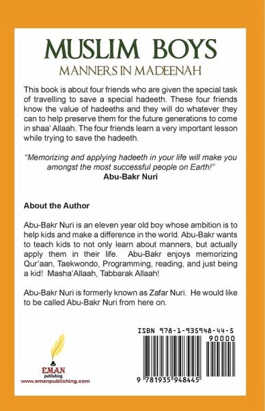 This book is about four friends who are given the special task of traveling to save a special hadeeth. These four friends know the value of hadeeths and they will do whatever they can to help preserve them for the future generations to come in shaa' Allaah. The four friends learn a very important lesson while trying to save the hadeeth. "Memorizing and applying hadeeth in your life will make you amongst the most successful people on Earth!" Abu-Bakr Nuri About the Author Abu-Bakr Nuri is an eleven year old boy whose ambition is to help kids and make a difference in the world. Abu-Bakr wants to teach kids to not only learn about manners, but actually apply them in their life. Abu-Bakr enjoys memorizing Qur'aan, Taekwondo, Programming, reading, and just being a kid! Masha'Allaah, Tabbarak Allaah! Abu-Bakr Nuri is formerly known as Zafar Nuri. He would like to be called Abu-Bakr Nuri from here on.