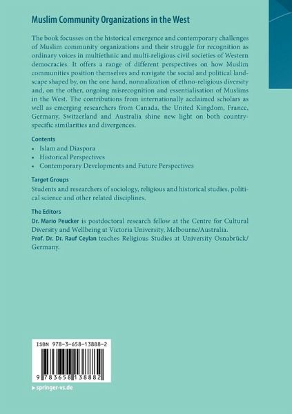 The book focusses on the historical emergence and contemporary challenges of Muslim community organizations and their struggle for recognition as ordinary voices in multiethnic and multi-religious civil societies of Western democracies. It offers a range of different perspectives on how Muslim communities position themselves and navigate the social and political landscape shaped by, on the one hand, normalization of ethno-religious diversity and, on the other, ongoing misrecognition and essentialisation of Muslims in the West. The contributions from internationally acclaimed scholars as well as emerging researchers from Canada, the United Kingdom, France, Germany, Switzerland and Australia shine new light on both country-specific similarities and divergences.